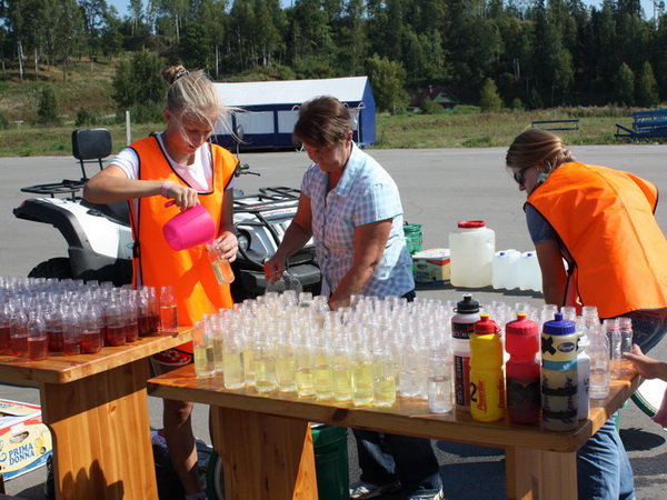 Кому-то общественных пунктов питания может не хватить. Поэтому надо подготовить фляжки или питьевой рюкзак с водой или напитком. Можно взять с собой немного еды, например батончик-мюсли, печенье, зефир. Рекомендуется взять с собой резервную простую воду. Она может пригодиться после финиша для питья в дороге или мытья. Не следует наливать фляжки до самого верха, так как тяжёлая фляга может вылететь от тряски. Без опыта участия в соревнованиях, конечно, сложно определить необходимое количество питья и еды. Поэтому надо знать, что запасы всегда можно пополнить на пунктах питания. Со временем вы научитесь чётко определять количество питья и еды, а также режим питания.
