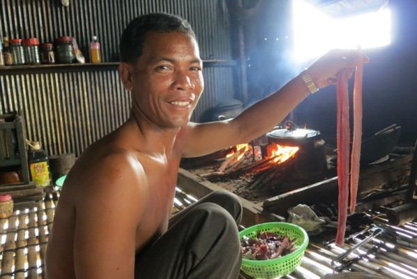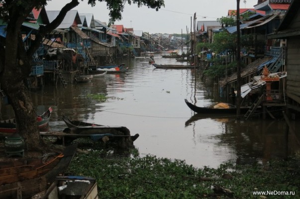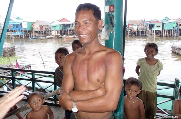 По дороге разговариваем с Лаки относительно праздничного ужина и вообще еды. И разговор как-то заходит о том, что водится в этих затопленных водой лесах и полях. Лаки говорит – здесь кроме рыбы (а рыбу мой сын почему-то как еду отвергает) очень вкусные крысы и змеи. Ну, поговорили и поговорили, а по дороге наш Кэп заруливает в один дом для разгрузки доставленного бензина – для лодок и генератора, а Лаки о чем-то оживленно разговорился с хозяином. Отходим дальше, а этот кхмер хитро улыбается и говорит – будет твоему сыну праздничный обед, я договорился. Отлично! У нас есть около часа для пока хозяева приготовят, а мы пока продолжим экскурсию по деревне и озеру.