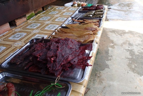 Одной святой водой сыт не будешь, поэтому по дороге к реке зашли на базарчик и купили вяленую змею (на фото вторая, желтенькая). И тут же съели.