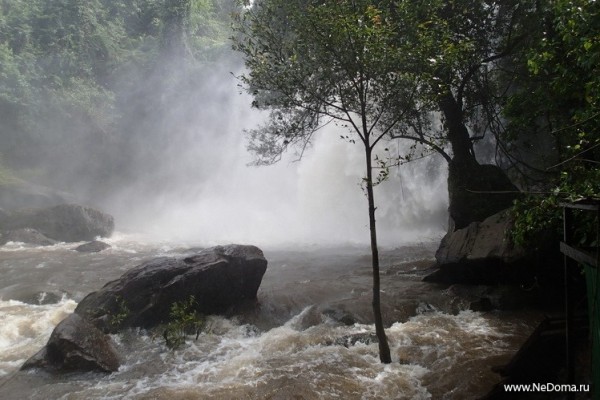 По тропе, идущей вверх по течению Игорь привел нас еще в одно почитаемое местными место – необыкновенный источник, глубиной по разным оценкам от 4 до 8 метров (на самом деле по- видимому глубина меняется в зависимости от времени года, и, соответственно, силы потока воды). В период засухи на дне, говорят, можно увидеть скульптуру Будды, лежащего как живого, очень естественно, как спящего. Мы ничего не увидели, так как потоки воды очень бурно перемешивали песок со дна. Но одну особенность не заметить было нельзя – вода в источнике была разной плотности. На глубине около метра мусор, который тонет в обычной воде (щепки красного дерева, какие-то соринки, веточки и прочее, что обычно лежит на дне) плавают как на пленке, колышатся вместе с поднимающим песок потоком. Весьма забавно – как бензин в воде. На самом деле, над всем этим около метра чистейшей воды. Лаки весьма трепетно отнесся к этому месту, призвав и нас не проводить здесь физические опыты. Постояв и бросив монетки, пошли к машине, расплатились с юным охранником и поехали заряжаться дальше – на водопад. Водопад метров 50 в ширину и метров 70 в высоту – весьма впечатляющ для равнинной местности.