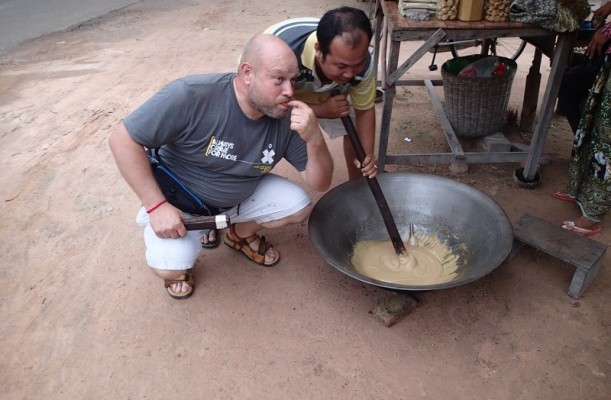 Сироп можно употреблять уже в этом виде как мед или варенье (на нем и самогонку местную ставят, но, как мы не уговаривали, нам её не продали), а можно разложить его по формочкам и дать высохнуть – получатся такие сахарные карамельки. У меня дома так высохли, что не разгрызть. В общем, поварили мы сахар, купили палочки для суши и чесалки для спины из пальмового дерева, ну, и сахар в пальмовых листьях в презент.