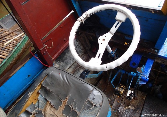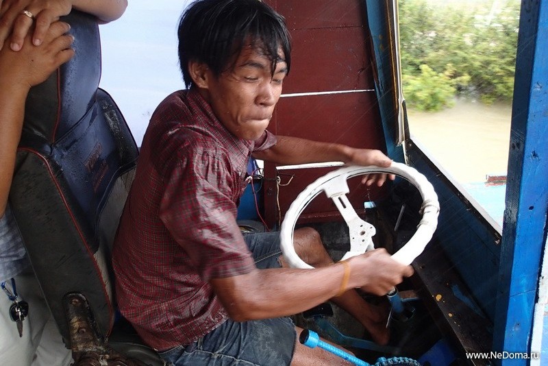 А два разомкнутых проводка на фото выше – замок зажигания. Но она движется, и, как оказалось, не в самом плохом состоянии относительно других таких же лодок, снующих туда-сюда. Так что осмелев, высаживаем капитана и по очереди, начиная с именинника, принимаем управление этим транспортным средством. Вокруг залитые поля, дорога совсем пропала под водой. Впереди рыбацкая деревня. Дома на сваях, люди, которые всю свою жизнь проводят на воде. Полиция, сельсовет – все присутствует но с «тонлесапским колоритом».