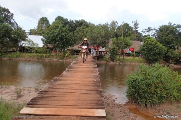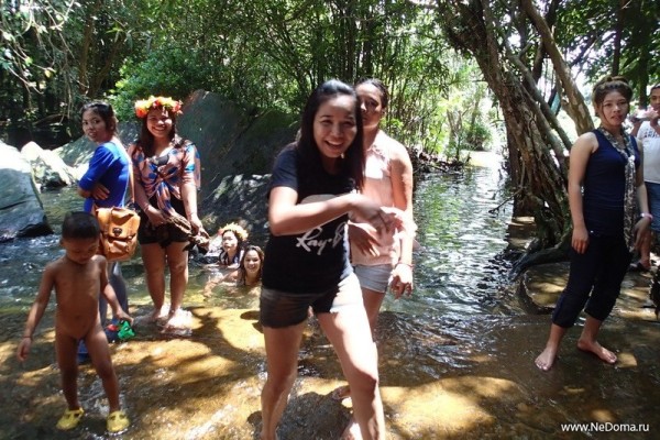 Через 15 минут клиент отошел и был готов к дальнейшей дороге, но когда пришла пора прыгать в седло, чувствую закружилась голова и у меня. Плюхнулся в тот же ручей, сняв только шлем. Тиран только умылся – ему к жаре и влажности не привыкать. С учетом случившегося до водопадов решили ехать по короткой дороге, а на них зависнуть на подольше. Менее чем за час выбрались из леса и по дороге быстро доехали до места. Здесь было замечательно – не очень жарко и целая река воды! У кхмеров опять был какой то праздник, поэтому на водопаде было достаточно многолюдно. Наше появление внесло некоторую суету среди «мирного населения», особенно женской половины.