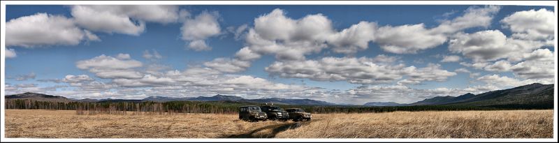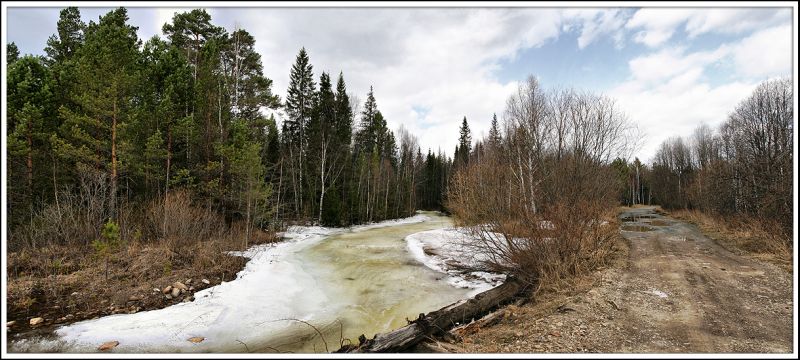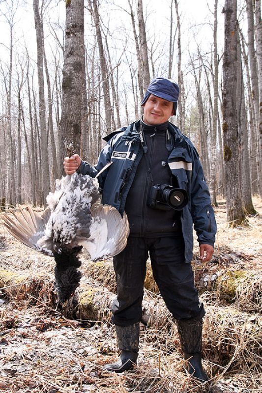 А вот и утро. Мало того, что всю ночь шел дождь - к утру все это еще и засыпало снегом. Градусник показывал -4. Был сварен суп, позавтракали. Экипаж Нивы стал чинить пульт от лебедки, я же пошел снимать бампер – вчера вырвало левый ролик у лебедки. Нашли в Хантере нужный болт, надо ставить, а то по закону подлости, первое же лебежение будет именно на эту сторону. К 11 часам все вроде было отремонтировано. Мы собрались и тронулись в путь. Озик показывал, что мы идем совершенно не по дороге, а по какой-то просеке, но выше по хребту она вроде как пересекалась еще с одной, а та, в свою очередь, - с нужной дорогой. Учитывая, что это было уже не первое расхождение местности с картой, мы продолжали подниматься. На этот раз Ниву пустили первой, дабы она не тонула в нашей колее. Буквально через километр от ночевки начались завалы. Какие-то удавалось выпилить, какие-то пришлось объезжать через лес. Уперлись в развилку, причем по карте она существенно дальше. Просека дальше вообще сильно завалена, а дорога поворачивает сильно на северо-восток. Пошли на разведку, Олег – по просеке, я - вверх по дороге. Просека и дальше оказалась не наезжена вообще, а дорога поначалу была сильно размытой и заросшей, но метров через 800 вроде как стала получше. Вернулся к машинам. Олега нет. Спрашиваем в рацию - говорит, что идет. Ждем. Приходит, приносит в руках глухаря. Откуда ?! В общем, пока разведывал, вспугнул он их там несколько штук. Причем один перелетел просеку, и Костя еще сказал, что вон, коршун от Олега летит. А я еще и зайца заметил - не полинял еще. Олег же, долго не думая, после пары кадров метнул в ближнего палкой. И попал! Тот от него бегом, он за ним. Носились они по бурелому минут пять, где-то вроде под деревом Олег даже застрял. Каким-то образом догнал он его, схватил за хвост, вырвал половину, потом снова схватил, ну, а дальше в ход уже пошли подручные средства. Однако, шулюм будет! Решили, что я попробую проехать по верхней дороге, а там уже видно будет. Тронулся, ломая кусты и мелкие деревья, – совсем конец пришел ЛКП. Проехал по своим следам - дальше дорога стала заворачивать в нужную нам сторону. Кликнул всех по рации, пошли дальше. Распили еще пару завалов и выскочили на нужную дорогу. Еще немного – и мы на перевале. Ура! Начинаем спуск – он гораздо круче подъема. Если через Юрюзань нет моста, то назад я точно не поднимусь. Постепенно начинаются просветы в лесу, становится видно долину реки. Настроение поднимается - на той стороне нормальная дорога. Лишь бы мост был. Уже понятно, что правильной дорогой идем, товарищи! Внезапно впереди идущая Нива проваливается в колею и на цепях мгновенно окапывается. Пока объезжаю, Олег пытается достать лебедку и выясняет, что оставил пульт на месте ночевки. Он решает вернуться за ним. Мы с Костей едем дальше, если будет напряжно – вернемся за Нивой. Спуск все круче. Упираемся в сильную промоину. Нужно закладывать. Меняем цепь на пиле, ищем дерево подходящее. И тут я поворачиваюсь и вижу за спиной реку! – УРА! Юрюзань!!! Только моста не видно. Мост находится быстро в кустах, однако состояние его удручающее. Мало того, что он раскачивается, когда на нем прыгаешь, так собака еще и провалилась лапой. Как сюда загонять двухтонные уазы – мало понятно. Пока смотрим как проехать, Костя вовсю пилит бревна, чтоб заложить первую промоину. Сам мост тоже с огромн