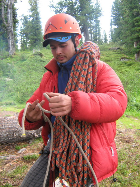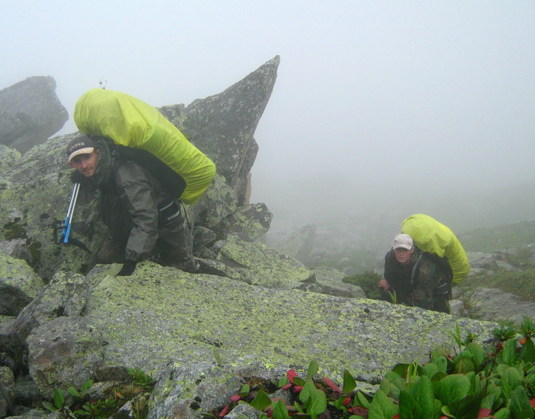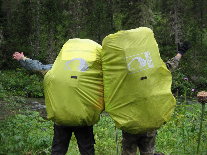 Палатки (двух- и трехместную) несли мужчины, у них же был тент на случай дождя (выручал много раз). Всякие веревки для крепления тента и прочих бытовых нужд – тоже у мужиков. Также, как и котелки (две штуки) с газовой горелкой и костровое (металлический тросик с крючками) + топор (топорище сломалось на середине пути) и пара веревочных пил (убили обе).