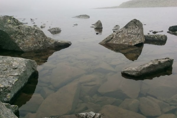 По плану дневка с восхождением желающих на Народа. Погода совсем испортилась, большая часть отлеживалась в палатках. Я решил пройтись вокруг Бублика. Туман, тихая гладь озера.