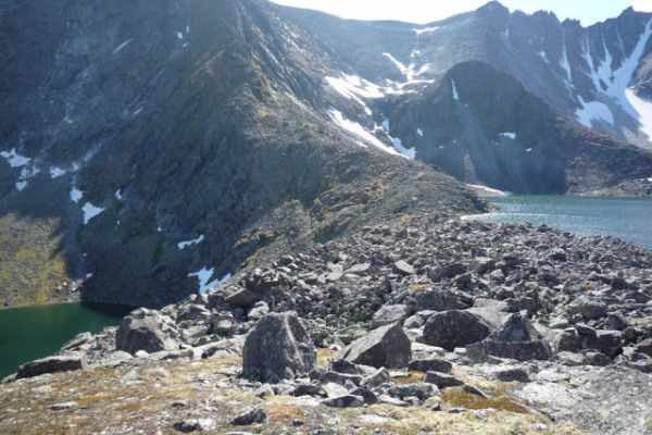 У подножья перевала мелкое озерцо с дном из кварцевого песка. Подъем достаточно крутой, камни крупные, есть пара снежников сбоку, в середине наверху что то типа скальника, который обходится слева (попроще) или справа.
