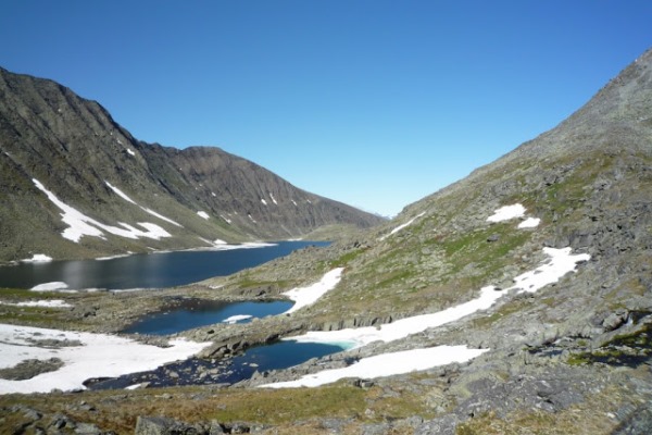 С утра мрачность исчезла, все стало очень позитивно, и мы двинулись к перевалу Хобе Западный. У подножья большой снежник, приличный набор высоты. По пути попадались прозрачные куски кварца. На вершине перевала каменная пирамидка и спуск. Причем явно более тяжелый, чем нелегкий подъем. Мы тут призадумались. Мы с Женей пошли осматривать соседние склоны для спуска, Алина углубилась в карту. Картина озер сверху несколько не соответствовала нашим ожиданиям. Постепенно выяснилось что спускаться надо было на несколько сотен метров правее. Там, где первоначально стояли, тянуло на спуск 3а. Рядом попроще, постепенно зигзагами, стараясь двигаться по травянистым участкам мы спустились вниз.