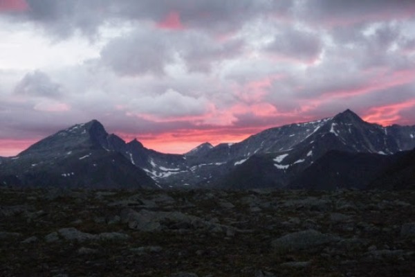 Поднялись к перевалу и остановились там на ночлег. Замечательный красный облачный закат. Перевал несложный.
