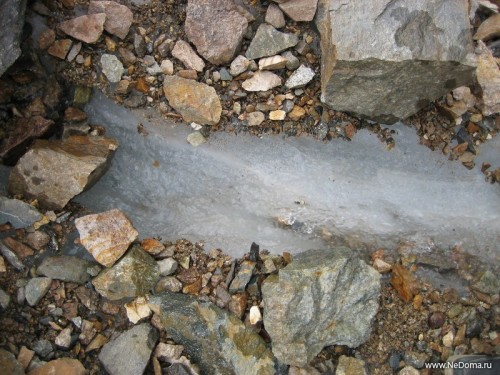 Через 3 часа лес закончился как-то внезапно, сменившись каменным рельефом, и мы вышли в морену Цейского ледника под палящее полуденное солнце. Теперь цель была более менее видна (хотя глазомер в горах абсолютно не работает – расстояния скрадываются, даря необоснованное чувство облегчения от мысли о скором окончании пути), но без вешек можно было упереться в скальные породы, потеряв несколько часов. От ощущения близости снега у меня открылось очередное дыхание, и вот, когда я включила ускорение, чтобы побыстрее выбраться с камней, впивающихся в ступни сквозь мягкие кроссовки (наивная, я думала, что дальше будет легче), мне вслед неслось: «Юлька, не лезь на лед! Только не лезь одна на лед!!!» Я даже остановилась в недоумении: какой лед? где? До первого снега, что я видела вдалеке, оставалось, по меньшей мере, километра два. А до этого надо было еще лезть на скалу прямо по курсу. Только через пару минут до меня дошло, что вот эта самая скала, обходить которую я думала, и есть лед – язык Цейского ледника.