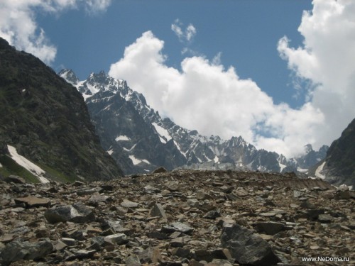 Перед мной был колоритный осетин в форме спасателя МЧС. Вот тут, я считаю, нам повезло: несмотря на наличие в группе альпиниста, уже забиравшегося на Цей, мчс’овец с сорокалетним стажем в горах, да еще и начальник Северо-Осетинского поисково-спасательного отряда МЧС РФ, что выяснилось уже позже, был очень хорошей поддержкой. За те 2 часа, что мы взбирались на высоту 2500 м по остаточной морене, представляющей собой сплошные камни, размером от детской головки до Оки, к ледопаду, мы услышали не только истории о ледниках и спасательной практике в горах. Например, на очередном привале выяснилось, что родной дядька нашего невольного проводника – автор памятника Салавату Юлаеву.