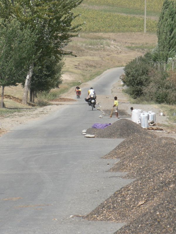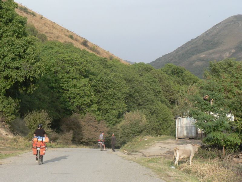 8 день. 13 августа 2008 г. Утро началось с новости, что командир отравился и лежит с температурой 39ºС. Чем - осталось загадкой, так как все ели и пили одно и тоже. Ему накипятили воды и сказали промывать желудок, но видимо поздно начали - пошла интоксикация в организме. Дима и Рома сходили на рынок и купили продукты: немного риса и манки для разнообразия. В целом концепция питания осталась прежней, правда решили пойти без тушенки. Рома просверлил стойки багажника Данила и укрепил их болтовым соединением. Постарались максимально заклеить все камеры. К вечеру руководителю вызвали скорую и его увезли в больницу, Дима его сопровождал. Леха, Игорь и Данил в это время съездили в санаторий «Жалалабат», осмотрели его и набрали минеральной воды. Начальник вернулся из больницы после капельницы с физраствором жив-здоров. Вроде завтра собираемся выезжать. За прошедший день выяснили, что мы поселились в местном борделе: весь день в единственный оставшийся четвертый номер реальные киргизы привозили реальных киргизок ну и… Везде валяются использованные контрацептивы, и гуляют муравьи – вообще ничего так разместились! Продолжали весь день кушать (кроме Паши) в кафе при гостинице с пиво-водко. Ферганская долина удивила огромным количеством автомобилей марки Daewoo Tico - стало понятно, где они востребованы. Потери: - время из-за отравления Паши. Погода: сухо, температура не зафиксирована – очень жарко. 9 день. 14 августа 2008 г. Утро началось с новости, что Данил тоже отравился и лежит с температурой 39ºС. Чем — все также осталось загадкой. Но он хотя бы, услышав вчерашние рассказы Игоря про промывание желудка, ночью чудесной минералкой из санатория по возможности промыл себе желудок. К обеду он оклемался, и на 16.00 назначили выезд, а то мы тут подзадержались. После обеда к гостинице подъехал на велосипеде капиталист - оказался из Швейцарии. Маленько пообщались - тоже путешествует уже полгода. Паша починил горелку, вынув установленный дополнительный фильтр. На обед была уже становящаяся невыносимой гречка. Тронулись в 18.00 - долго ковырялись. При выезде выяснили, что у Паши лопнула возвратная пружина колодок переднего гидравлического тормоза Джуси3, запасной нет. За два часа проехали без происшествий 25 км с набором 200 м и остановились на ночь, практически, в поле, у арыка. Деревню проехали, не набрав воды, - потом пришлось посылать двух гонцов. Она здесь покупная, но нам так дали. После жития в борделе начались философские вечера, темы которых были разнообразны, но часто в них присутствовало слово «секс». Уже обсуждено: что есть любовь, дружба, дружеский секс; нужны ли нежные создания женского пола в походе и их статус (отношение с участниками или руководителем, занимаемая должность); можно ли и нужно со своими женщинами ходить в походы. На ужин был пустой диетический рис. Леха начинает потихоньку бунтовать, так как мяса нет, да еще и Паша запретил есть в придорожных харчевнях. После борделя у всех наблюдается стабильное послабление в кишечнике. Игорь все сожалеет, что забыл дома корешки кровохлебки. Потери: - время из-за отравления Данила; - лопнула возвратная пружина колодок переднего гидравлического тормоза Джуси3 у Паши. Погода: сухо, температура не зафиксирована – очень жарко. 10 день. 15 августа 2008 г. Встали жутко рано - в 5.00 (обалдеть!), выехали в 8.00, до 11.00 постепенно наб