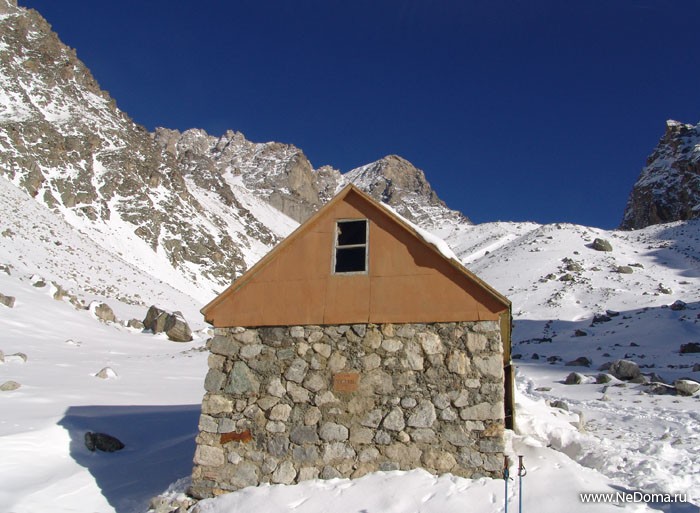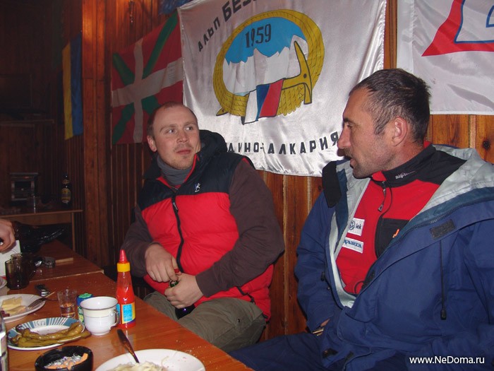 Глава 4. Восхождение и счастливое схождение Ане стало лучше. Прогноз обещал нам как минимум три дня хорошей погоды. Рюкзаки были собраны. Завтрак забит в пузики и животики. И в 8.00 мы с Аней сделали первые шаги к исполнению своей мечты, взяв направление на хижину Укю-Кош. Подъем на этот раз дался для меня совсем легко и непринужденно: то ли от того, что я акклиматизировался, то ли потому, что постоянно сопровождал Аню с ее невысоким темпом ходьбы. Через четыре с половиной часа мы были в хижине. Здесь, я думаю, надо будет сделать некоторые пояснение. Причиной медленного движения Ани была не плохая физическая форма, как подумали некоторые компетентные товарищи, а тяжелый перелом колена, перенесенный ей полгода назад. И я считаю, что своим восхождением и вообще мужественным поведением, она показала пример для подражания мне и всем, кто ее окружает. Быстренько перекусили и побежали налегке тропить дорогу на завтра. Попутно любуясь вечерними горами. С наступлением сумерек вернулись в хижину и принялись за готовку. Надо сказать, что больше всего в процессе приготовления пищи меня вдохновила растопка снега. Я понял, что если бы не моя нынешняя работа, то с удовольствием пошел работать топщиком снега. Такая креативная и нужная профессия в горах! В планах нашего инструктора на следующий день были снежные занятия. Но мы прибегли к силе слова и, посмотрев на наши просящие мордашки, Андрей сжалился - согласился идти на вершину 09.10.2009 года. В 19.00 часов я уже видел сны. Проснулся раньше всех. Натопил снега. Перекусили. И в 6.00 вышли на восхождение. Читая много книг про альпинизм, я заметил, что почему-то самая скучная часть - это описание восхождения. Поэтому описывать его не буду. Скажу только, что, во-первых, я все равно с непривычки изорвал себе кошками все штаны. А когда поднялся на вершину горы Гидан (4200 м) маршрутом 1 Б категории сложности, понял, что ради этих мгновений я готов отдать многое, и обязательно приеду следующим летом в альплагерь для учебы на третий разряд по альпинизму. Спуск занял несравненно меньше времени. Шли огромным склоном по слежавшемуся снегу, как по ступенькам. Как правильно подметил Димон, чувствовал я себя полным лошарой. Так много вниз по снегу пешком я еще никогда не ходил. Были бы лыжи… Остроту спуску придавали видимые на противоположном склоне цирка следы от схода «снежных досок». А нам со Спириком, как знают некоторые недомовцы, рассказывать, что такое лавина не надо. В общем, не шатко не валко были мы в хижине в 18.00. Поставив рекорд по длительности восхождения! О чем, как я говорил выше, ни капли не жалеем. 50 грамм спирта на брата. Пир горой и мертвецкий сон. Проснулся я, когда мне приснился тушканчик в камуфляжной форме, и понял, что спать больше нельзя. Конечно же, никакого настроя на снежные занятия ни у кого не было. И в обед 10.11.2009 года мы были в АУСБ «Безенги», где гуляли до поздней ночи, а о профессиональном празднике даже и не вспомнили. Глава 5. Дни после восхождения Когда дело сделано, все сразу невообразимо меняется. Хотя я и понимаю, что это только первый шаг и до «сделанного дела» еще очень далеко, но все же настрой уже другой. «Дышится» легче. Можно позволить себе рисковать и пить больше. Пару раз позанимались на скалах, а так - все больше гуляли, веселились. Вечером перед отъездом собрались в каминном зале и в торжественной