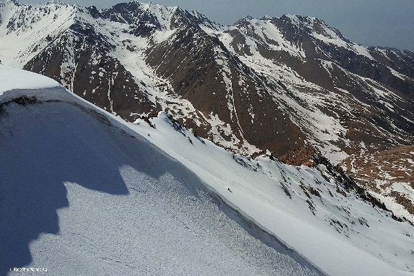 На следующий день мы отправились в горы с первыми лучами солнца. Поход по хребтам и скалам к точке нашего старта на вершине Карнизная занял почти 6 часов. Маршрут к старту проходил в основном по скальным гребням, поэтому использовать скитур было невозможно и пришлось целый день лазить по скалам в горнолыжных ботинках, пару раз переодеваться в треккинговую обувь и нести рюкзак с лыжами и ботинками весом 15-17 кг. Ходить по горам на высотах в районе 4000 метров довольно тяжело, если подумать, то мало где в мире вообще катаются фрирайд на таких высотах – и это уже гораздо ближе к ски-альпинизму. Например, в итальянской Аосте, где я живу и много тренируюсь в последние годы, это соответствует спуску с вершины Гран Парадизо.