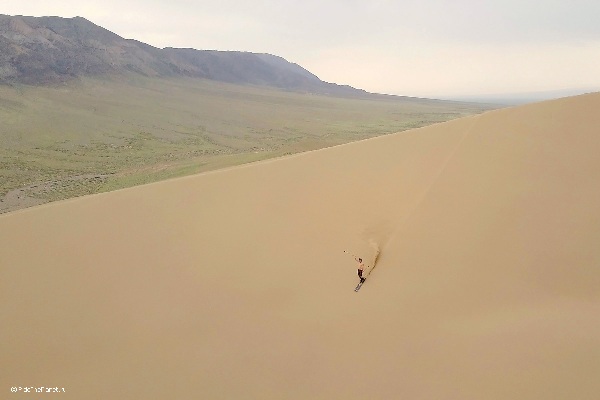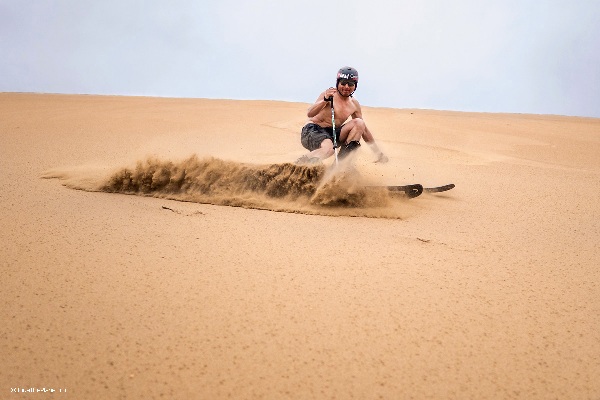 Возможно вам не покажется отличной идеей кататься на новых дорогих лыжах по песку, но меня это не смутило. Ощущение восторга от происходящего почти не перебивалось усталостью от бесконечного подъема по гребню дюны, когда ноги в горнолыжных ботинках сильно вязнут, а в глаза непрерывно летит песок, поднимаемый с гребня дюны сильным ветром. В какой-то момент очень сильно задуло, и меня окатило волной из песка, в которую мне пришлось нырнуть с головой за впечатлениями и красивыми кадрами. Я сделал несколько спусков с вершины дюны, приспособился к скольжению, и в какой-то момент мне удалось взорвать этот «песочный паудер».