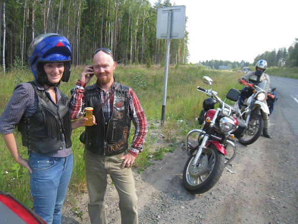 Держим путь в Питер. Дорога местами хорошая, местами асфальта нет совсем. Пейзажи очень красивые. Чем ближе к Питеру, тем дорога более загружена. Остановились попить кофе в придорожной кафешке. Заодно связались с Игорем на счет вписки в Петере. Он сказал, что будет в городе только после 23 часов, так что нам предстояло где-то скоротать 3 часа. Тут к нам подъехал мототурист на КТМ, это оказался Катз из содружества мототуристов. Материализовались Лёхины мысли – он хотел посмотреть именно этот КТМ на слете Мототрэвэлс, но потом слет перенесли, и Лёха расстроился, что не посмотрит этот КТМ. А тут он сам к нам приехал.