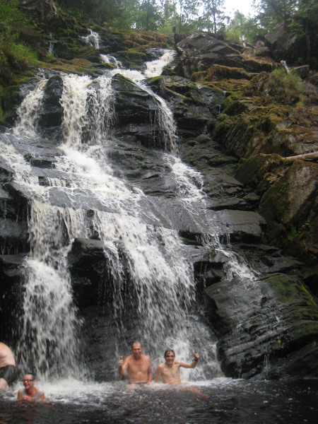 Водопад действительно красивый, особенно, думаю, весной, когда воды больше. Решили искупаться. Отличный гидромассаж, я вам скажу, получается, когда встаешь под водопад. Отлично освежились, очень рады остались, что нашли это место. До Рускеалы добрались, когда уже начинало темнеть. Нашли место, координаты которого нам дал Руст. Место живописное: журчит вода , плавают утки, лес красивый. Сварили спагетти с сосисками. Решили, что ложкой это будет есть банально, и настругали из веток палочки для еды. Очень по-японски.