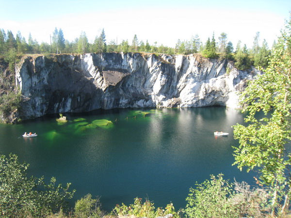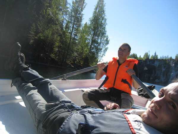 Каньон действительно поражает своей красотой, очень живописное место. Отсюда добывали мрамор для многих дворцов Петербурга в своё время. Сначала мы обошли его пешочком, а затем взяли лодку на прокат на час. Забавно, за эту поездку удалось не только на байке покататься, но еще и на велосипеде, а теперь еще и на лодке погрести.