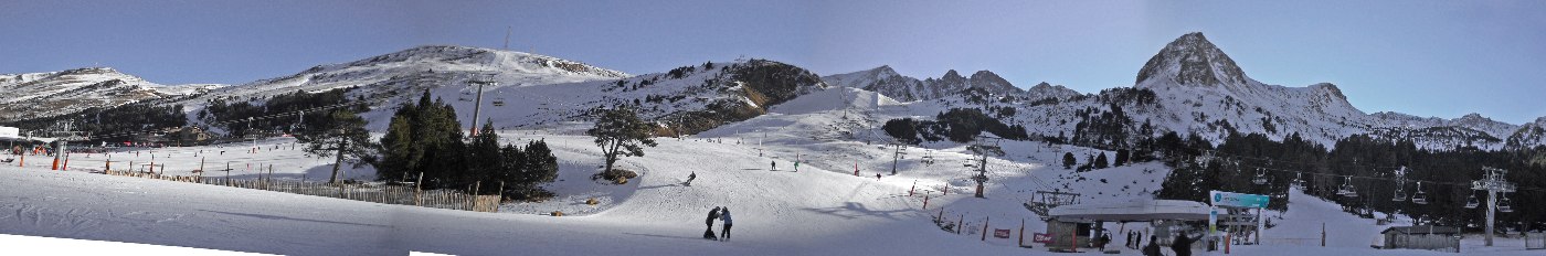 Вечером у Хорхе оплатили ски-пасы «5 из 7», взяли квитанции, которые потом надо будет обменять на ски-пасы в кассе. Так, действительно, немного выгоднее, так как гид дает скидку 10%. - А я в советские времена уууууу…. - А я в советские времена оооооо… 16.01. Катание. Обменяли квиточки на ски-пасы. Первый день катания решили устроить разведочным, то есть максимально проехаться вдаль и узнать где и что. Наша зона катания так и называется «Пас де ла Касса». Очень широкая. С разнообразными участками рельефа. 6 креселок и беби-лифт. 3 на перевал и 3 внутри долины. Часть трасс отратрачена, часть нет. Есть такие места, при взгляде на которые, я понимала - мне туда рано соваться, а на некоторые – поздно, а большинство – в самый раз. Сначала все шло великолепно, как задумано. Мы организованно поднялись на перевал между зонами катания Паса и Грау Руж, скатились вниз по очень длинной трассе, и обнаружили, что из шести человек нас осталось только трое. Это уже Грау Руж. Взгляд назад на перевал с Пасом