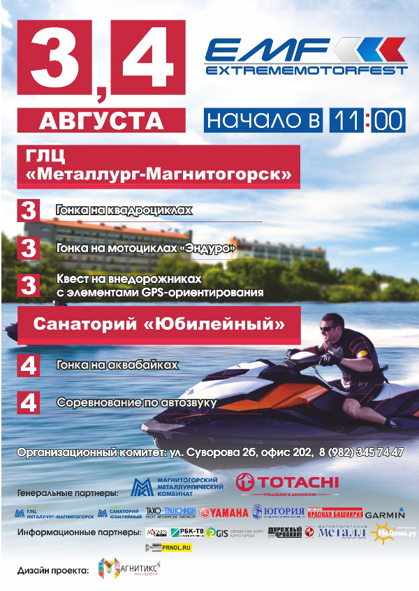 Фестиваль Extreme Motor Fest 2013 будет проходить в 2 этапа: 3 августа 2013 на территории ГЛЦ «Металлург-Магнитогорск» и окрестностях состоятся соревнования по трофи спринту на мотоциклах и квадроциклах и GPS- ориентированию на внедорожниках, а 4 августа 2013г на оз.Банное на территории санатория «Юбилейный» состоятся соревнование по аквабайку и соревнования по автозвуку.