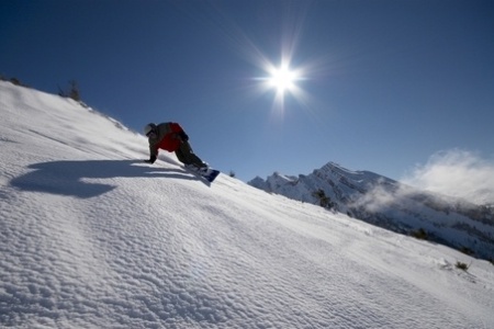Параллельный слалом. Два спортсмена спускаются по параллельным трассам с установленными на них флагами синего и красного цветов.