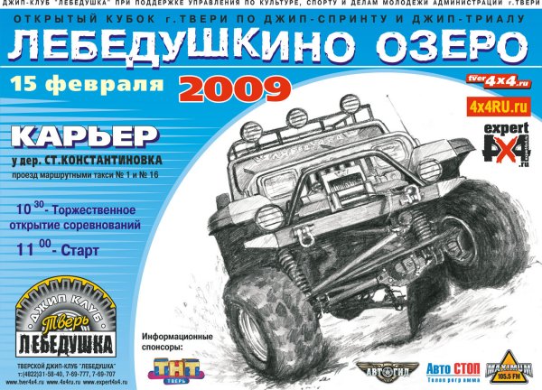 Тверской джип-клуб «Лебёдушка» при поддержке Администрации города Твери и партнеров 15 февраля в районе деревни Старая Константиновка Тверской области проводит Открытый Кубок города Твери по джип-спринту и джип-триалу «Лебёдушкино Озеро-2009».