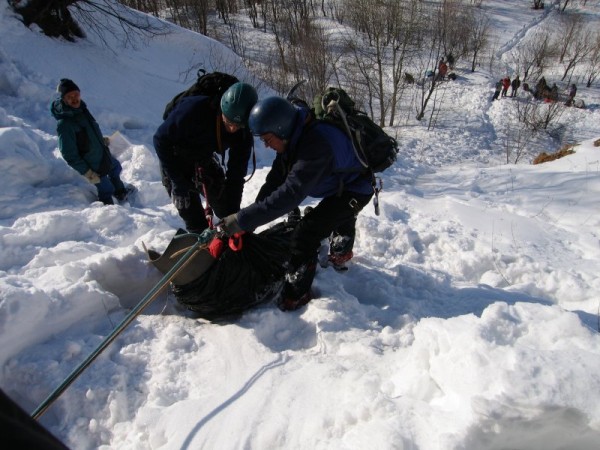 Спуск недееспособного пострадавшего по склону с различными видами рельефа.