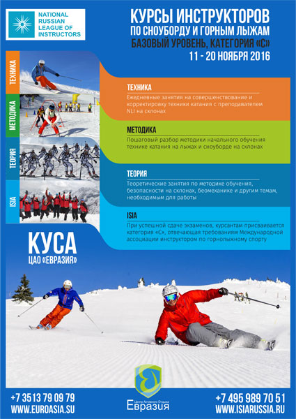 С 11 по 20 ноября 2016 года на территории ЦАО «Евразия» состоятся курсы по подготовке инструкторов категории «С» по горнолыжному спорту и сноуборду.