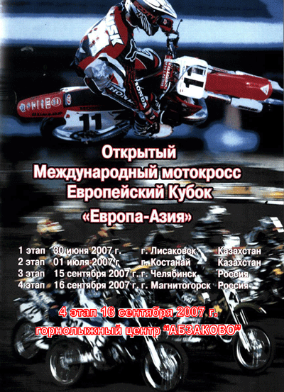 3. Дата и место проведения. Международный мотокросс Европейский Кубок Восточной зоны проводится 1 этап - 30 июня 2007 года г. Лисаковск Казахстан 2 этап-01 июля 2007 года г.Костанай Казахстан 3 этап -15 сентября 2007 года г. Челябинск Россия 4 этап -16 сентября 2007 года Г Л Ц "Абзаково" Россия