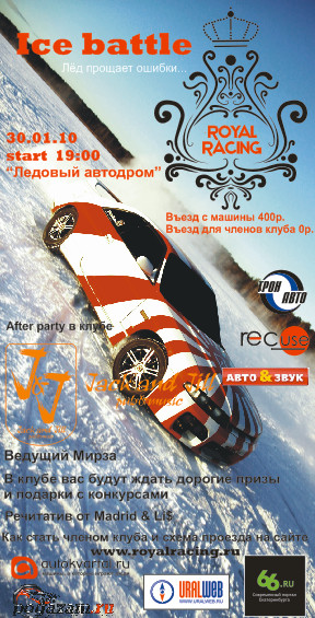 В 23:00 Roayl Racing Club выдвигается в клуб "Jack & Jill". На закрытой парковке будут стоять шоу-карс. Атмосферу разогреют два Subaru? напичканные музыкой. В клубе вас будут ждать дорогие призы и подарки с конкурсами. А также выступят Madrid & Li$.