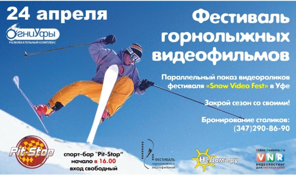 Уфа. 24 апреля. 16.00. Спорт-бар «Pit-Stop» (РК «Огни Уфы»). Портал НеДома.ру проводит параллельный показ финального события фестиваля “Snow Video Fest”, на котором будут представлены лучшие работы любителей сноуборда и горных лыж.