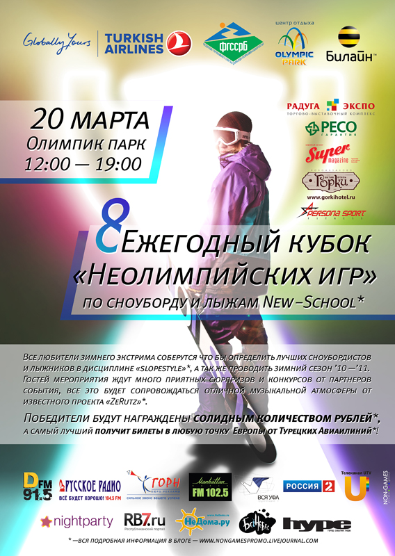 20 марта в СОК «Олимпик парк» состоится праздник, ставший уже традиционным для всех любителей зимнего экстрима, - «Кубок Неолимпийских игр». В честь закрытия зимнего сезона состоятся соревнования среди сноубордистов и лыжников New School.
