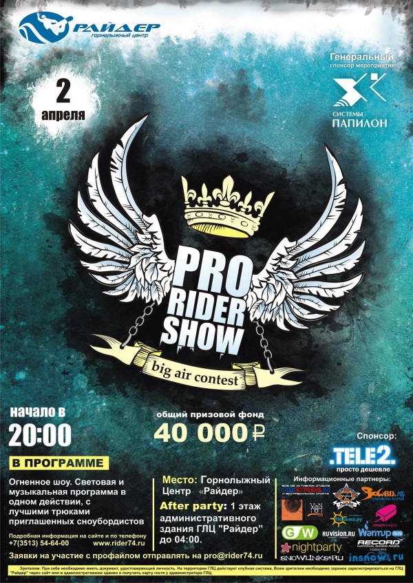 Они будут сражаться за право быть лучшими, показывая невероятные трюки. Сражаться за звание PRORIDER от Горнолыжного центра «Райдер» и за общий призовой фонд в 40000 рублей.