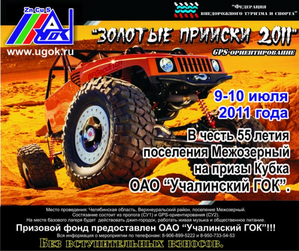 При поддержке Дата проведения 9 июля 2011 года. Начало в 10:00. Будет организован Весь день играет живая музыка, питание, шашлыки на мангале, общепит К нам в гости приезжает детский дом города Учалы. На протяжении всего соревнования будет проходить Частный Регламент соревнования Цели и задачи: — Популяризация внедорожного туризма и спорта. — Повышение уровня водительского мастерства в сложных дорожных условиях, привлечение молодежи к техническим видам спорта. — Предоставление возможности общения и обмена опытом для любителей внедорожных автомобильных видов спорта. — Вовлечение новых участников во внедорожные дисциплины. — Пропаганда здорового образа жизни и активного семейного отдыха, правильное отношение к окружающей среде. Без Призовой фонд сопоставим с масштабам мероприятия! Расписание 9 июля 10:00 Регистрация участников 11:30 Тех. комиссия 12:30 Брифинг и встреча с детьми из детского дома г. Учалы 14:30 Старт 1 Спец. Участка (Пролог) 20:00 Финиш 1 Спец. Участка 20:45 Брифинг 2 Спец Участка 21:15 Старт 2 Спец. Участка ( 10 июля Cool 11: 30 Финиш 2 Спец. Участка 14:30 Награждение Участников Участники К участию в соревнованиях «Золотые Прииски 2011» допускаются физические лица, достигшие восемнадцатилетнего возраста и имеющие водительское удостоверение категории «В». Максимальное количество членов экипажа 5 человек. Запрещается: участвовать в соревнованиях лицам, находящимся в состоянии алкогольного или наркотического опьянения, а также после применения лекарств, замедляющих реакцию. Организатор вправе не допустить к участию в соревнованиях любого водителя, нарушившего требования данного регламента. Автомобили участников К соревнованиям допускаются участники на любых легковых внедорожных автомобилях, соответствующих категории «В» классификации РФ, при условии, что водитель, указанный в заявке несет полную ответственность за автомобиль, на котором он участвует в соревнованиях. Автомобили участников делятся на три зачетные группы: класс «Стандарт», класс «Экстрим» и класс «Спорт». Press Point Для создания большей зрелищности, в наиболее ярких местах на трассах организованы Для аккредитации журналистов на внедорожной гонке «Золотые Прииски 2011», необходимо подать заявку организаторам гонки. Все аккредитованные журналисты будут обеспечены фирменной одеждой мероприятия, спецжилетами «Пресса», горячим питанием, а также специальным транспортом для подъезда в районы проведения гонки для фото и видеосъёмки. Напоминаем про необходимость наличия высоких сапог (забродники) и средств защиты от насекомых для подхода к месту движения автомобилей спортсменов. Телефон для подачи заявки Условия проведения Желающий принять участие в соревнованиях «Золотые Прииски 2011» заполняет анкету участника, предъявляет водительское удостоверение. После этого ставит свой автомобиль в закрытый парк. Соревнования проводятся на специально подготовленной трассе, имеющей два специальных участка, представляющие собой старые заброшенные золотоносные прииски. Участники стартуют в соответствии с заявленным классом. Для каждого класса своя трасса. Лучшим результатом С.У.-1 считается наименьшее время прохождения трассы. По итогам С.У.-1 начисляются часы среди трех первых экипажей в каждом классе. С.У.-2 считается максимальное количество взятых К.П. + минимальное короткое в