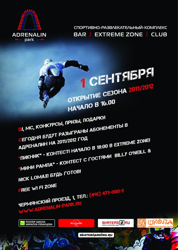 1 сентября в 16:00 спортивно-развлекательный комплекс Адреналин вдохнет жизнь и откроет свои двери сезону 2011/2012 по адресу г. Москва, Чермянский проезд, д.1.