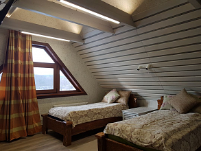 На втором этаже 2 спальни, одна проходная. В первой две полуторные кровати, телевизор, журнальный столик, вешалка для одежды.