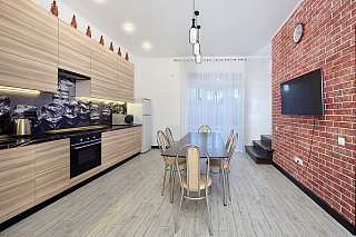 1 этаж: тёплые полы, большая гостиная с телевизором (Wi Fi) и диваном, обеденная зона (встраиваемая техника, холодильник, микроволновка, духовой шкаф- печь, стиральная машина, вся необходимая посуда, кухонные принадлежности), санузел с душем. Мангальная зона с выходом из гостиной.