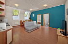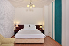 Основное здание на 12 номеров. Номера вместимостью от двух до шести человек с большой гостиной-студией с удобным диваном, кухонной зоной, большими спальнями. Каждый номер оборудован всем необходимым для комфортного проживания. Также в основном здании круглосуточный ресепшен и управляющий, готовый всегда прийти Вам на помощь. В здании есть сауна, спортивный зал, бильярдная, детская комната.