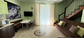 ЖК "Межгорье" на оз. Банном. В доме два этажа. Теплые полы на первом этаже. Три отдельные спальные комнаты. Большая гостиная с кухней (плита, холодильник, микроволновая печь, стиральная машина).