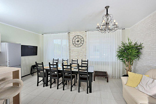 2 этаж: Большая гостиная с зоной отдыха, кухней, оборудованной духовым шкафом, посудомоечной машиной, большой обеденной зоной, а также ванная комната (ванна, душ, санузел, умывальник, стиральная машина)