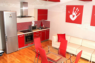 1 этаж:Гостиная с мягкой мебелью (два раскладных дивана), ТВ плазма, ДВД.Оборудованная кухонная зона (кух.гарнитур, посуда, микроволновка, эл. чайник, плита с духовкой, холодильник, стекл. стол). Спальня (2х спальная кровать, шкаф-купе, тумбочки). Умывальник, санузел.