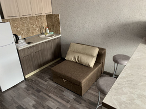 В квартире имеется все необходимое для комфортного отдыха двух человек + есть доп место. В номере есть: кухонный гарнитур, электрическая плитка, телевизор, холодильник, микроволновая печь, чайник, фен, необходимая посуда.