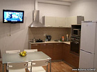 Квартира оснащена четырьмя двуспальными диванами (как полноценные двуспальные кровати); телевизор, холодильник, керамическая плита (4 конфорки), духовой шкаф, микроволновка, обеденная зона, электро-чайник, журнальный стол, чайная и столовая посуда, столовые приборы, тарелки на 9 персон, комплект кастрюль (3л и 1л), сковородки. фильтр для воды.