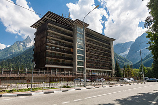 Гостиница «Горные вершины» представляет собой 8-ми этажный корпус более, чем на 300 мест. Уютные двух- и трёхместные номера, полулюксы, люксы. Во всех номерах все удобства, телевизор. Холодильники есть только в номерах «полулюкс» и «люкс».
