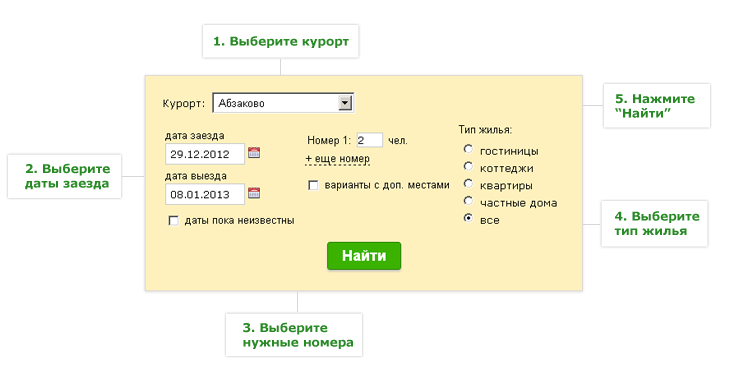 Бронировать номера в нашей системе можно самостоятельно прямо на сайте или через операторов, позвонив по указанному справа телефону. Начните с главной страницы поиска: укажите курорт, даты заезда и количество номеров: По вашим условиям система найдет и предложит подходящие варианты свободных номеров. Все эти номера есть в наличии и их можно сразу забронировать:
