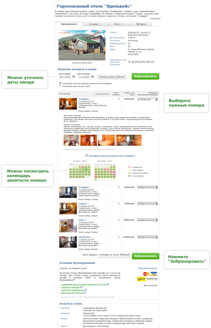 На странице отеля есть вся информация, необходимая вам для принятия решения: подробное описание номеров, фотографии, отзывы, расположение на карте, предоставляемые услуги и условия проживания. Выберите нужные номера в выпадающем списке и нажмите "Забронировать":