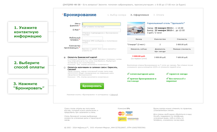 На следующей странице внимательно проверьте параметры вашего бронирования: отель, даты заезда и выбранные номера (дополнительные места, если это необходимо). Укажите свою контактную информацию, выберите способ оплаты и нажмите "Бронировать":