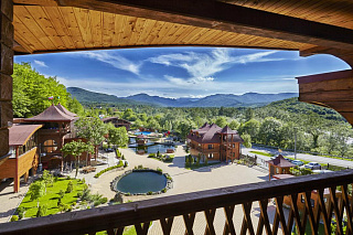 Ухоженная территория с авторским ландшафтным дизайном, пруды с грациозными лебедями, озеро для рыбалки, горный питьевой источник, две баньки на дровах, одна из которой с купелью наполненной родниковой водой, удобные беседки, детская площадка с батутом и тренажерами, детская комната с аниматорами, бесплатный бильярд и настольный теннис, а также уникальный мини-зоопарк!