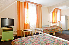 Номера которые мы рекомендуем семьям с маленькими детьми. Большой, хорошо оборудованный номер, двуспальная кровать, раскладной 2-х местный диван. Туалет, душ, небольшая кухня, барная стойка, плита, телевизор, шкаф, прихожая с зеркалом, кофейный столик. Имеется возможность поставить дополнительную раскладушку.