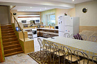 Просторная кухня-прихожая с большим столом на 14 посадочных мест. Кухонная зона оснащена всем для приготовления пищи и сервировки стола. Имеются: электроплита с духовкой, микроволновая печь, холодильник, электрочайники, полный набор посуды.